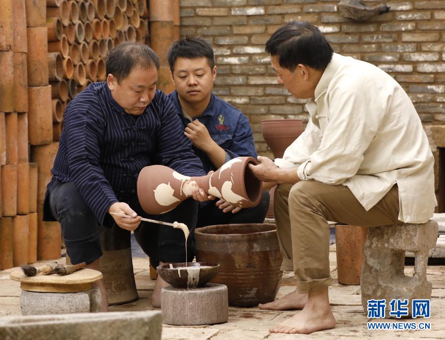 平頂山學院陶瓷學院院長梅國建(右一)指導徒弟為花瓷腰鼓施斑釉(資料照片)。新華社發