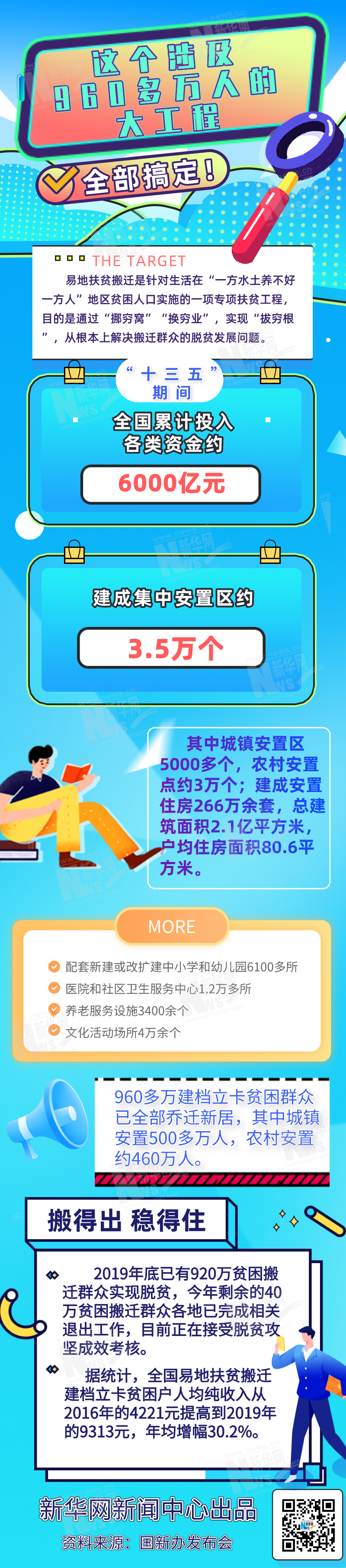 新華網(wǎng)北京12月3日電(汪亞)國務(wù)院新聞辦公室于今日舉行新聞發(fā)布會,介紹易地扶貧搬遷工作情況。國家發(fā)展改革委秘書長趙辰昕在發(fā)布會透露,“十三五”期間,全國累計投入各類資金約6000億元,建成集中安置區(qū)約3.5萬個,960多萬建檔立卡貧困群眾已全部喬遷新居,其中城鎮(zhèn)安置500多萬人,農(nóng)村安置約460萬人。