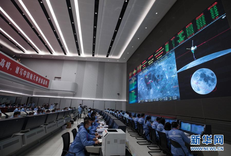 12月6日,航天科技人員在北京航天飛行控制中心指揮大廳監測嫦娥五號上升器在軌將月球樣品容器轉移至返回器情況。