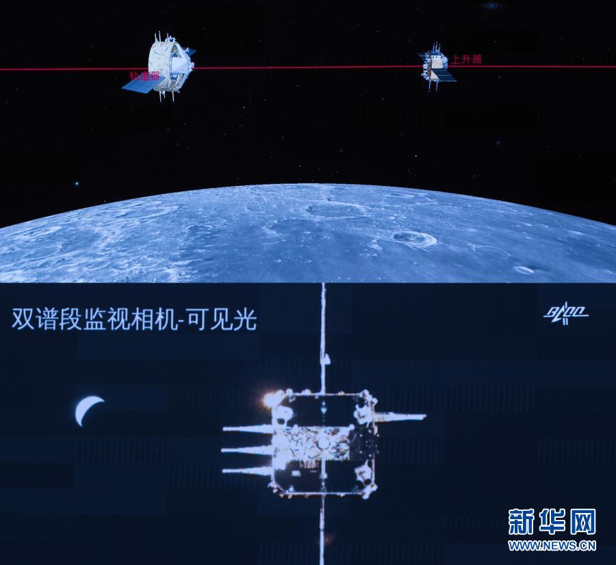 這是12月6日在北京航天飛行控制中心指揮大廳拍攝的嫦娥五號(hào)上升器與軌道器返回器組合體交會(huì)對(duì)接畫面。