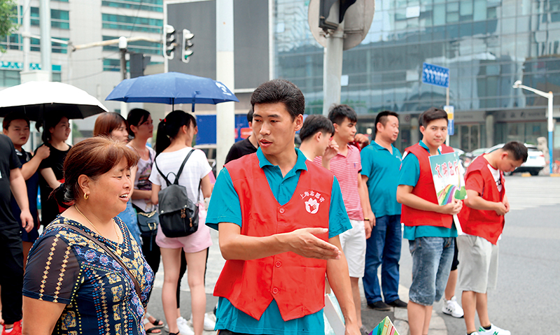 2018年夏季,快遞小哥柴閃閃在上海火車站南廣場(chǎng)恒豐路口做文明出行的指路志愿者