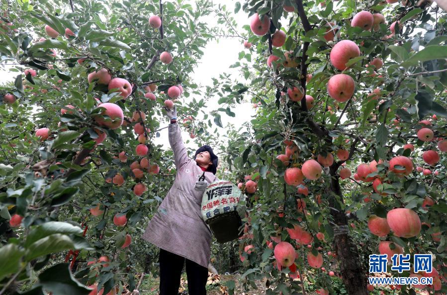 在石家莊市井陘縣孫莊鄉(xiāng)洛陽(yáng)村蘋(píng)果園內(nèi),農(nóng)戶(hù)在采摘蘋(píng)果(10月20日攝)。新華社發(fā)(梁子棟 攝)