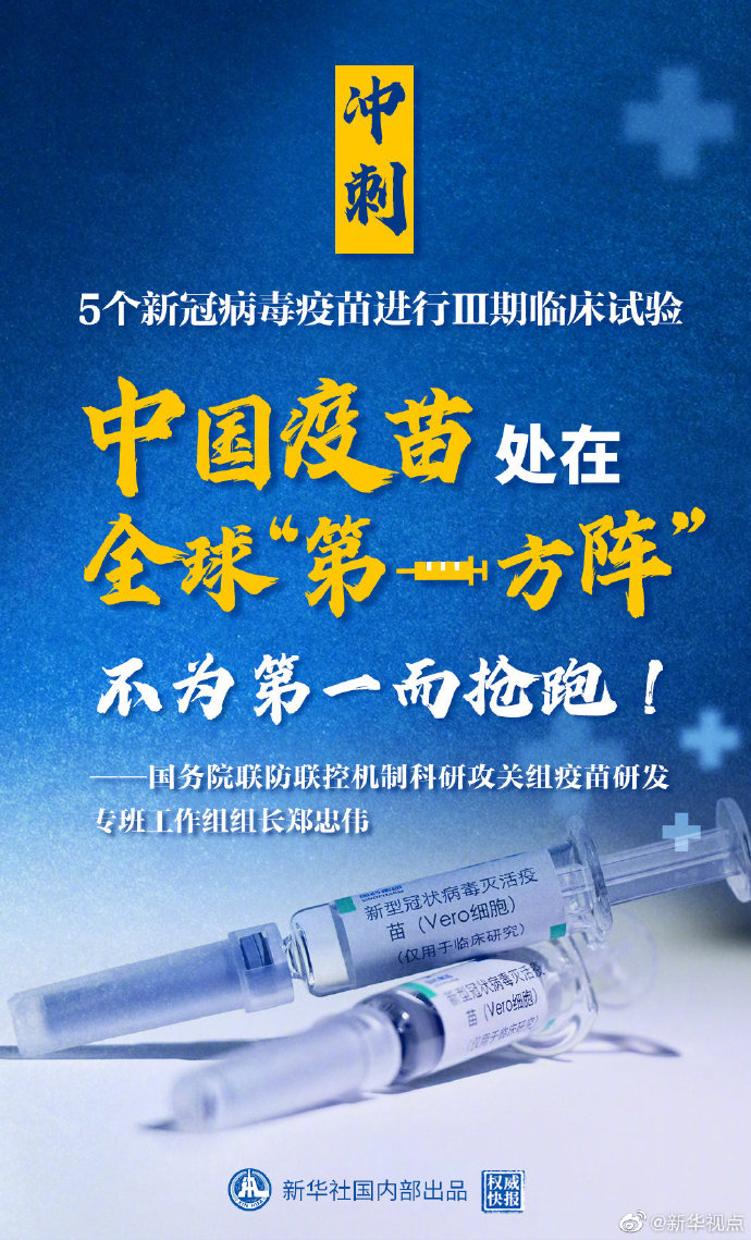“我國目前已有5個新冠病毒疫苗進(jìn)行Ⅲ期臨床試驗,數(shù)量位于全球前列。”國務(wù)院聯(lián)防聯(lián)控機(jī)制科研攻關(guān)組疫苗研發(fā)專班工作組組長鄭忠偉接受新華社記者專訪時說,“疫苗研發(fā)已經(jīng)進(jìn)入沖刺階段,我們處于全球第一方陣,但不為第一而搶跑。”“評價一個疫苗需要多項綜合指標(biāo),其中安全性、有效性、可及性、可負(fù)擔(dān)性是最重要的。”(記者:陳芳、董瑞豐 海報設(shè)計:張惠慧)