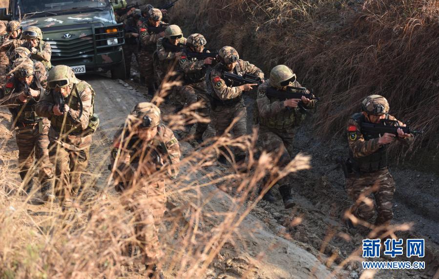 武警安徽總隊某特戰分隊與陸軍某旅防空營在皖東腹地開展戰術訓練交流(12月6日攝)。新華社發(徐偉 攝)