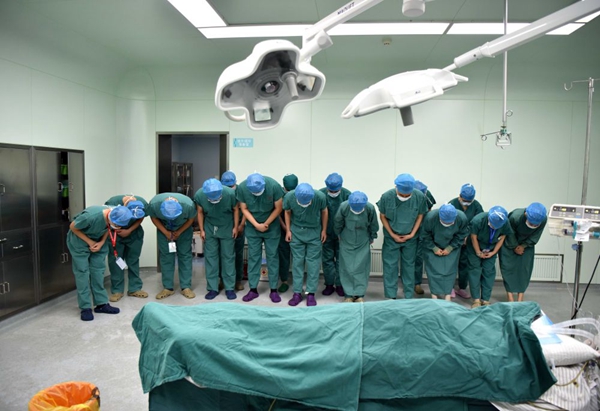 ▲ 2016年9月29日,在安徽省立醫(yī)院,工作人員向志愿捐獻器官的41歲援藏醫(yī)生趙炬的遺體告別。新華社發(fā) 周誠攝