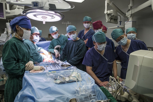 ▲ 2016年12月21日,首都醫(yī)科大學附屬北京友誼醫(yī)院肝移植中心主任朱志軍教授(右二)和團隊成員一起為肝糖原累積癥患兒昊昊進行親體肝臟移植手術(shù)。新華社記者 沈伯韓攝