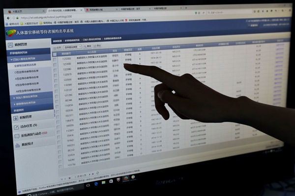 ▲ 在首都醫(yī)科大學附屬北京友誼醫(yī)院,一臺電腦顯示“中國人體器官分配與共享計算機系統(tǒng)”(COTRS)中的人體器官移植等待者預約名單。新華社記者 沈伯韓攝