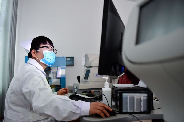 12月16日,海東市第二人民醫(yī)院眼科護(hù)士許國(guó)娟在給患者檢查眼睛。