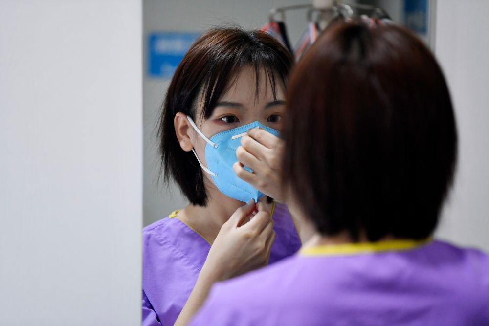 在天津醫(yī)科大學(xué)總醫(yī)院空港醫(yī)院,張碩在戴口罩準(zhǔn)備進入“紅區(qū)”工作(12月18日攝)。