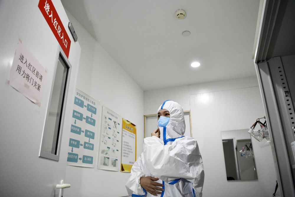 在天津醫(yī)科大學(xué)總醫(yī)院空港醫(yī)院,張碩在穿防護服準(zhǔn)備進入“紅區(qū)”工作(12月18日攝)。
