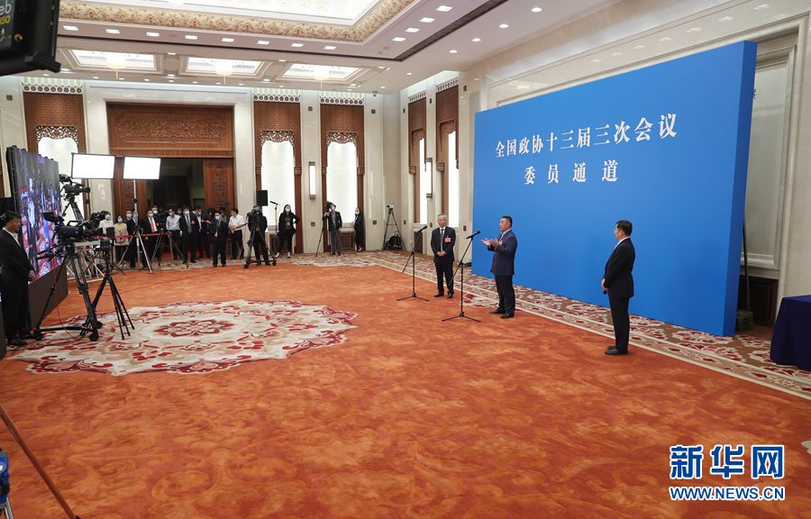 全國政協十三屆三次會議首場“委員通道”采訪活動于5月21日在人民大會堂新聞發布廳舉行,邀請部分全國政協委員通過網絡視頻方式接受媒體采訪。圖為“委員通道”現場。新華網 王翰林 攝