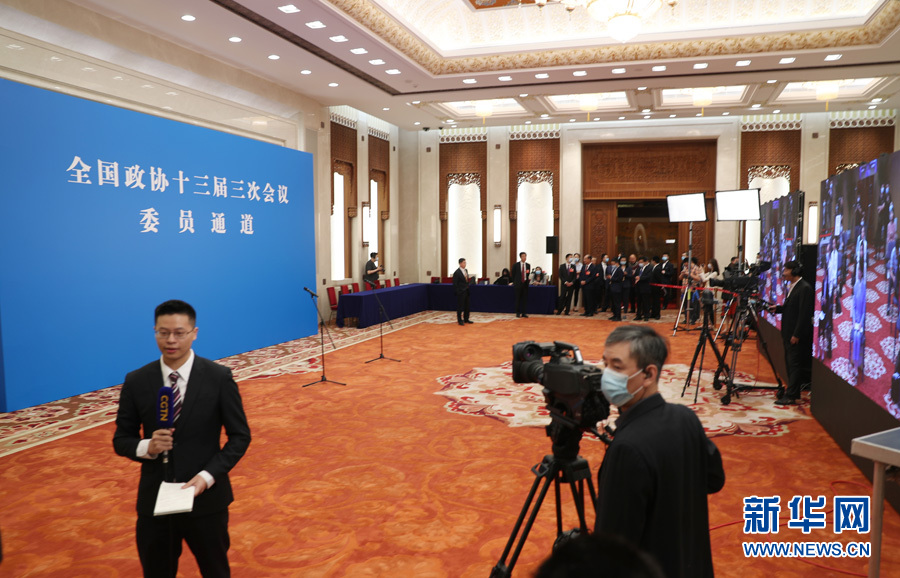 ??? 全國政協(xié)十三屆三次會議首場“委員通道”采訪活動于5月21日在人民大會堂新聞發(fā)布廳舉行,邀請部分全國政協(xié)委員通過網(wǎng)絡(luò)視頻方式接受媒體采訪。圖為“委員通道”現(xiàn)場。新華網(wǎng) 王翰林 攝