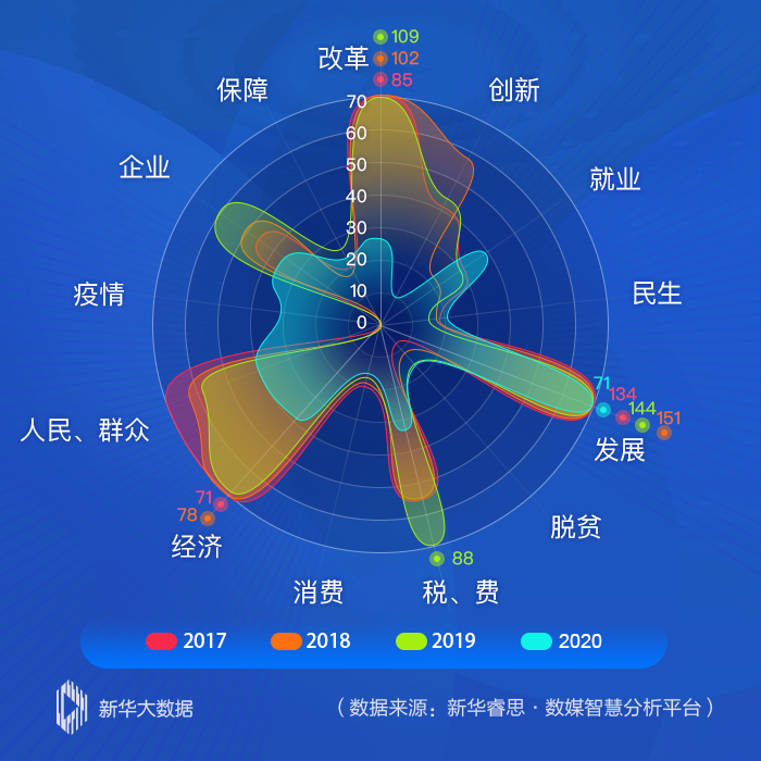 政府工作報(bào)告出爐,字斟句酌有多用心?新華睿思對(duì)2017年至2020年四年的政府工作報(bào)告進(jìn)行了文本語義分析。四年來,政府工作報(bào)告圍繞“發(fā)展”“改革”“經(jīng)濟(jì)”進(jìn)行了全面的闡述和工作部署,回應(yīng)群眾關(guān)切,堅(jiān)持把人民群眾的利益放在第一位。