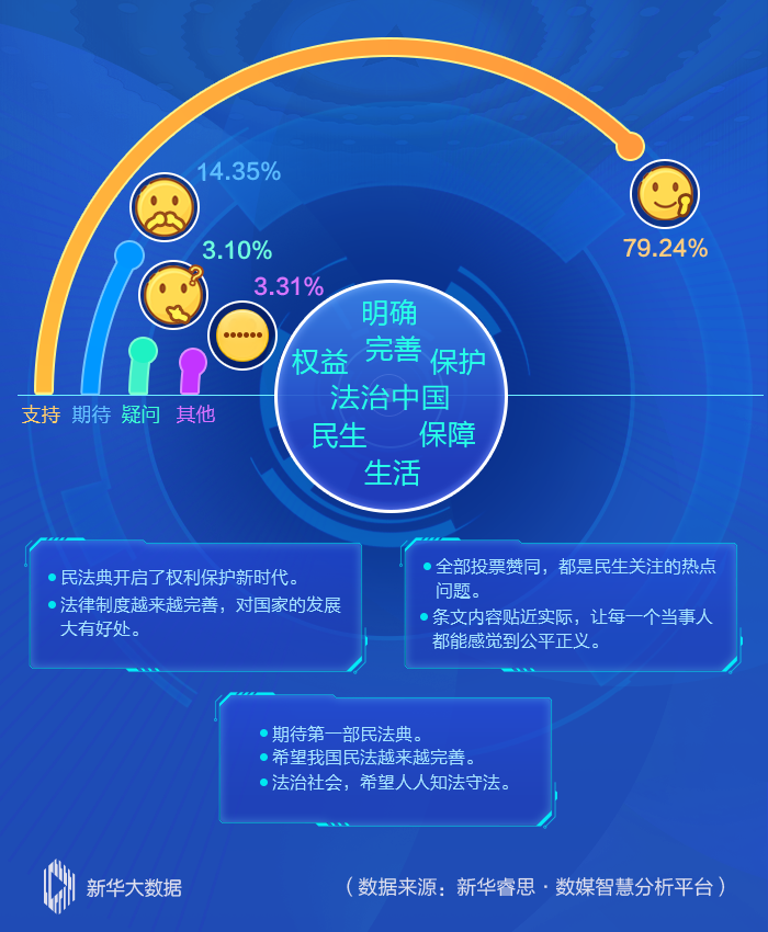 新華睿思數據顯示,近八成網民對民法典草案表示支持和肯定,認為“民法典開啟了權利保護新時代”“法治中國給老百姓帶來實實在在的好處”。從話題熱詞分析來看,“法治中國”“完善”“保護”三大熱詞有效地呼應了編纂民法典的出發點和落腳點。