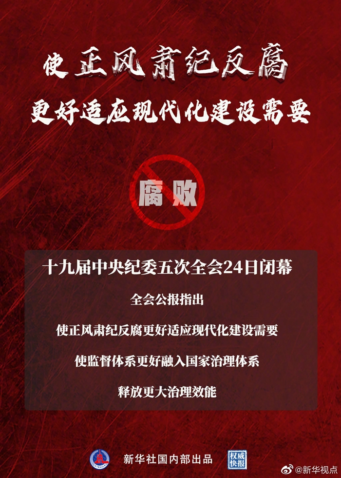24日,十九屆中央紀委五次全會閉幕。全會公報指出:使正風肅紀反腐更好適應現代化建設需要,使監督體系更好融入國家治理體系,釋放更大治理效能。(記者:朱基釵、孫少龍;海報設計:朱舜) ????