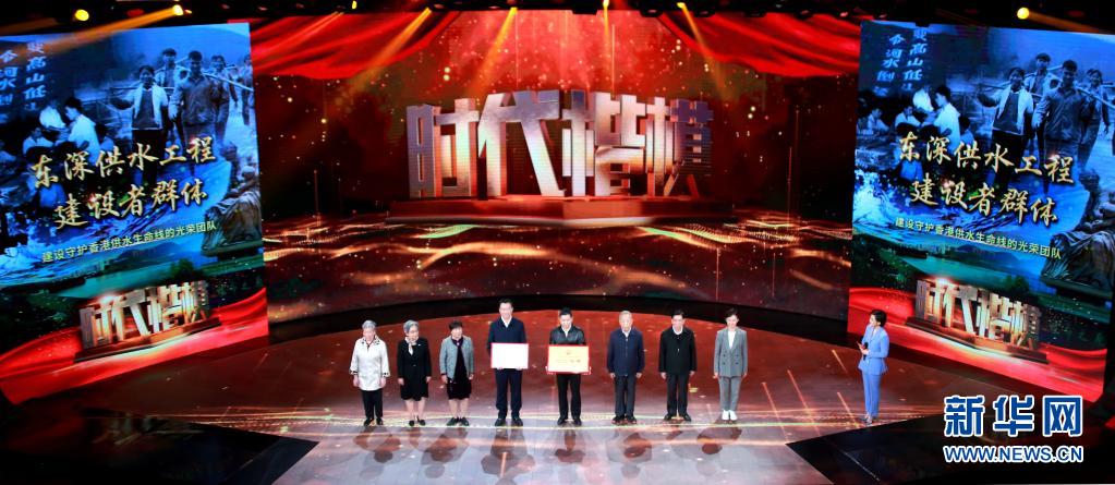 東深供水工程建設(shè)者群體代表在“時(shí)代楷模”發(fā)布儀式上領(lǐng)取“時(shí)代楷模”獎(jiǎng)牌和證書(2021年4月18日攝)。新華社記者 潘旭 攝