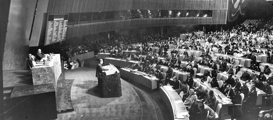 中華人民共和國代表團1971年11月15日出席了聯合國大會第二十六屆會議的全體會議,受到熱烈歡迎。新華社圖片