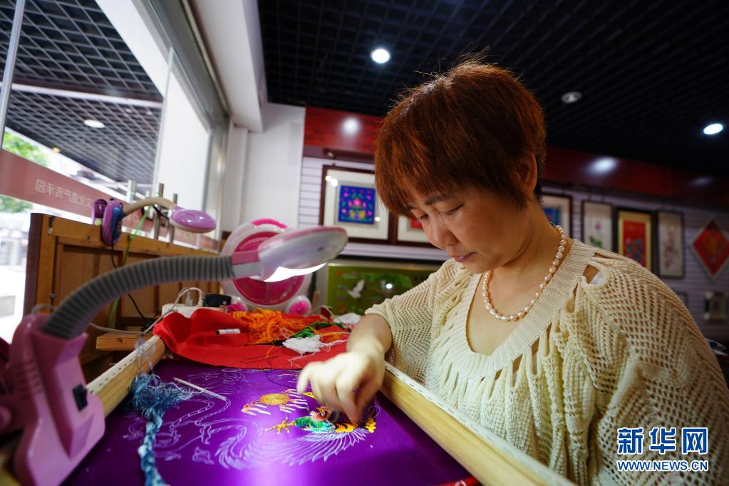 武漢市漢陽(yáng)區(qū)江欣苑社區(qū)居民在進(jìn)行非遺刺繡創(chuàng)作(7月18日攝)。新華社記者 邢廣利 攝