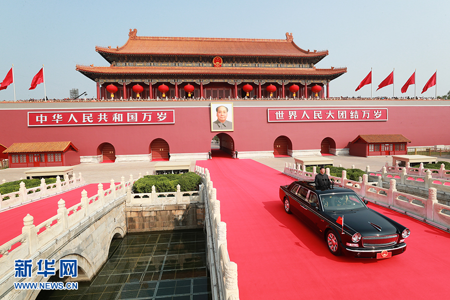 10月1日,慶祝中華人民共和國成立70周年大會在北京天安門廣場隆重舉行。中共中央總書記、國家主席、中央軍委主席習近平發表重要講話并檢閱受閱部隊。這是習近平乘坐檢閱車,經過金水橋,駛上長安街。 新華社記者 龐興雷 攝