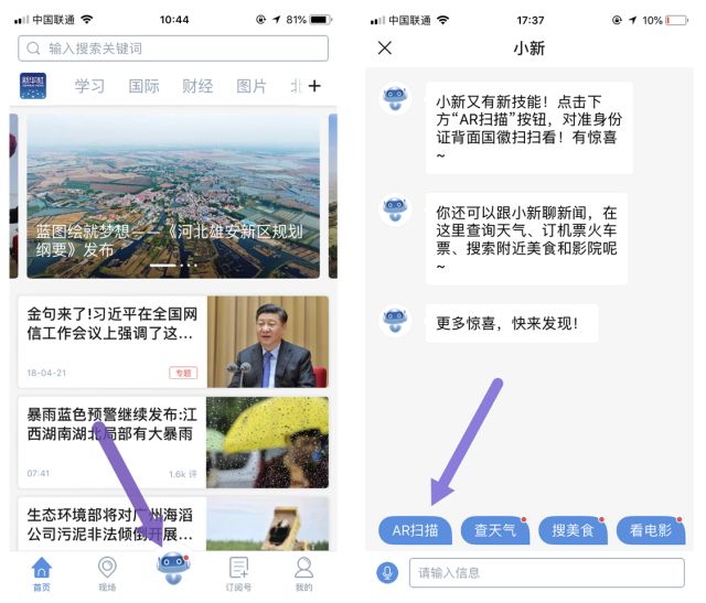 ↑進(jìn)入新華社客戶端首頁,點(diǎn)擊“小新機(jī)器人”后,選擇AR掃描功能(AR掃描功能不會(huì)保留任何用戶信息)。將新華社客戶端升級(jí)到最新版本可以獲得更好的體驗(yàn)。
