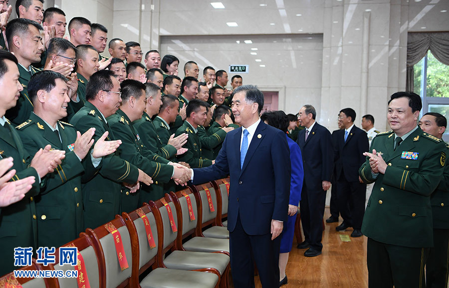 9月19日,中共中央政治局常委、全國政協(xié)主席、中央代表團團長汪洋率代表團部分成員分別赴寧夏軍區(qū)、武警寧夏總隊慰問,并會見自治區(qū)政法系統(tǒng)代表。這是汪洋慰問武警寧夏總隊官兵代表。 新華社記者 張領(lǐng) 攝