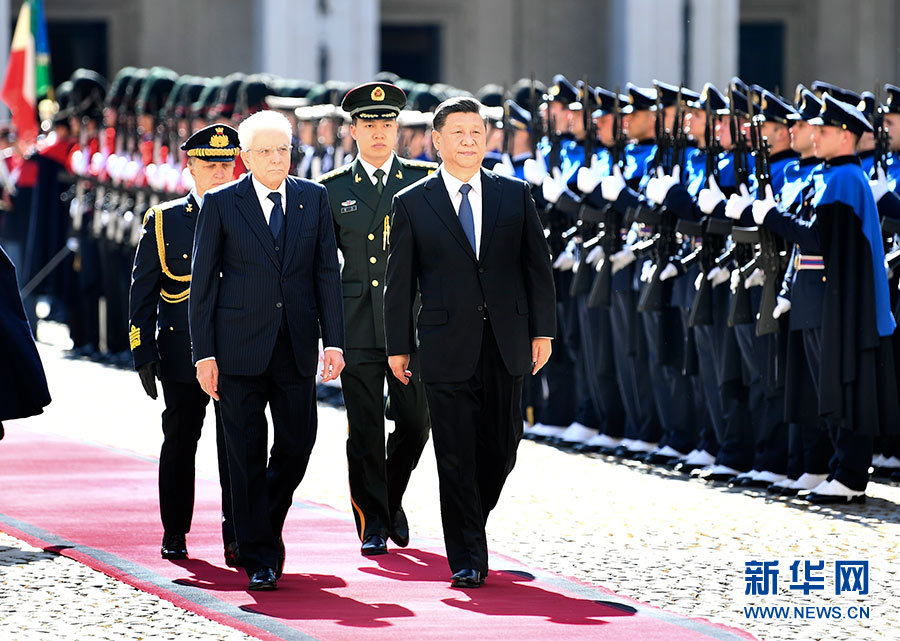 習近平和夫人彭麗媛抵達時,馬塔雷拉總統(tǒng)和女兒勞拉在停車處迎接,互致問候。隨后,軍樂團奏中國、意大利兩國國歌,升中國國旗。兩國元首一同檢閱儀仗隊。儀仗隊長趨前請習近平檢閱。習近平在馬塔雷拉總統(tǒng)陪同下依次檢閱陸軍、海軍、空軍和騎兵方隊。習近平同意方主要官員握手,馬塔雷拉總統(tǒng)同中方陪同人員握手。