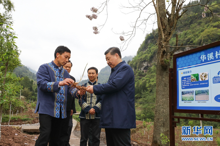 這是4月15日下午,習近平在石柱土家族自治縣中益鄉(xiāng)華溪村了解該村通過種植中藥材黃精等特色經(jīng)濟作物帶動村民脫貧的情況。 新華社記者 鞠鵬 攝
