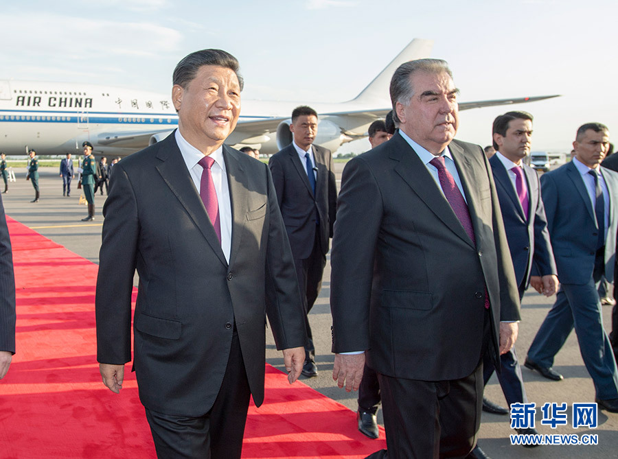 當地時間晚6時許,習近平乘坐的專機抵達杜尚別國際機場。習近平步出艙門,受到塔吉克斯坦總統拉赫蒙熱情迎接。塔吉克斯坦女青年向習近平獻花。禮兵分列紅地毯兩側。