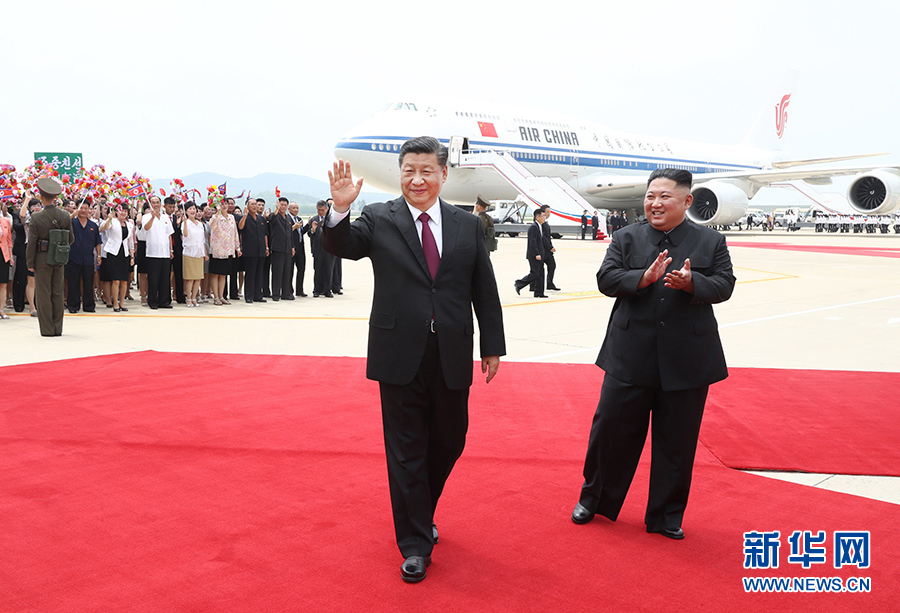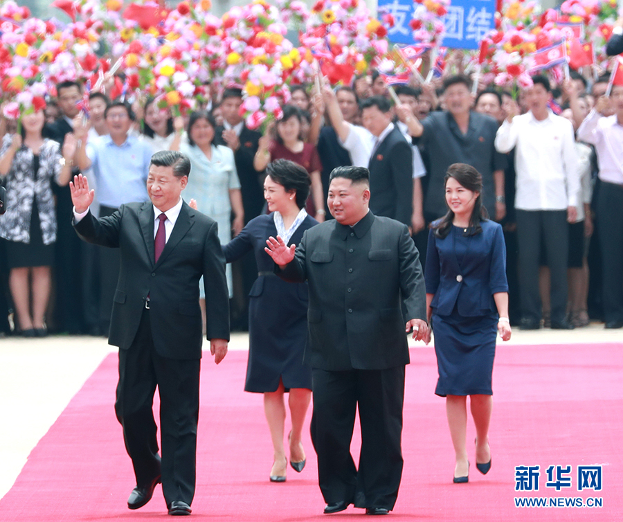 當(dāng)?shù)貢r間12時許,習(xí)近平乘坐的專機抵達平壤順安機場。雨后初晴的平壤,天高云淡、氣候怡人,到處郁郁蔥蔥、繁花似錦,整個城市洋溢著友好熱烈的氣氛。機場上中朝兩國國旗迎風(fēng)飄揚,“熱烈歡迎中國共產(chǎn)黨中央委員會總書記、中華人民共和國主席習(xí)近平同志”“鮮血凝成的朝中兩國人民之間牢不可破的友誼團結(jié)萬歲”大幅標(biāo)語高高懸掛,近萬名群眾排列成整齊的隊伍,有力地?fù)]動著花束,以歡快的口號和熱情的笑容,歡迎尊貴的中國客人到來。朝鮮勞動黨委員長、國務(wù)委員會委員長金正恩和夫人李雪主到機場迎接。