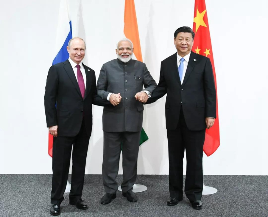 ↑6月28日,習(xí)主席在大阪出席中俄印領(lǐng)導(dǎo)人會(huì)晤,同俄羅斯總統(tǒng)普京、印度總理莫迪就當(dāng)前國(guó)際形勢(shì)、重大國(guó)際和地區(qū)問(wèn)題、三方合作深入交換意見(jiàn)。新華社記者謝環(huán)馳攝