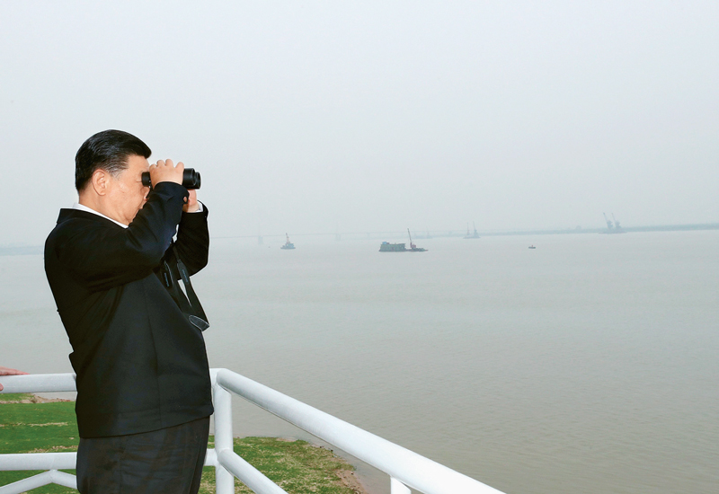 2018年4月26日下午,中共中央總書記、國家主席、中央軍委主席習近平在武漢主持召開深入推動長江經濟帶發展座談會并發表重要講話。這是座談會前,習近平于25日上午乘船沿江察看兩岸生態環境和發展建設情況。 新華社記者 謝環馳/攝