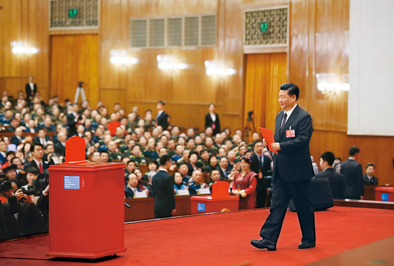 2018年3月17日,十三屆全國人大一次會議在北京人民大會堂舉行第五次全體會議。習近平當選中華人民共和國主席、中華人民共和國中央軍事委員會主席。這是習近平準備投票。 新華社記者 蘭紅光/攝