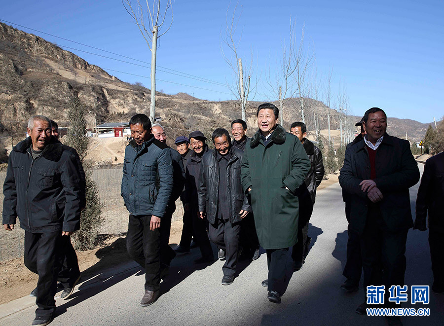 2015年2月13日,農(nóng)歷羊年春節(jié)來臨之際,習(xí)近平在陜西延安市延川縣文安驛鎮(zhèn)梁家河村調(diào)研時同村民邊走邊聊。新華社記者 蘭紅光 攝