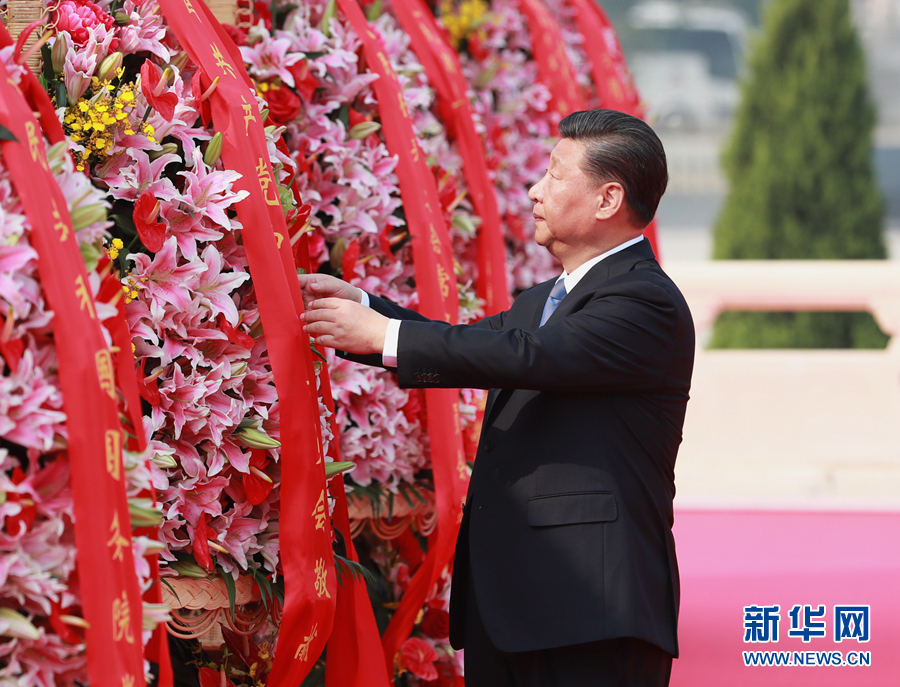 9月30日上午,習近平、李克強、栗戰(zhàn)書、汪洋、王滬寧、趙樂際、韓正、王岐山等黨和國家領(lǐng)導人來到北京天安門廣場,出席烈士紀念日向人民英雄敬獻花籃儀式。這是習近平整理花籃上的緞帶。 新華社記者 龐興雷 攝