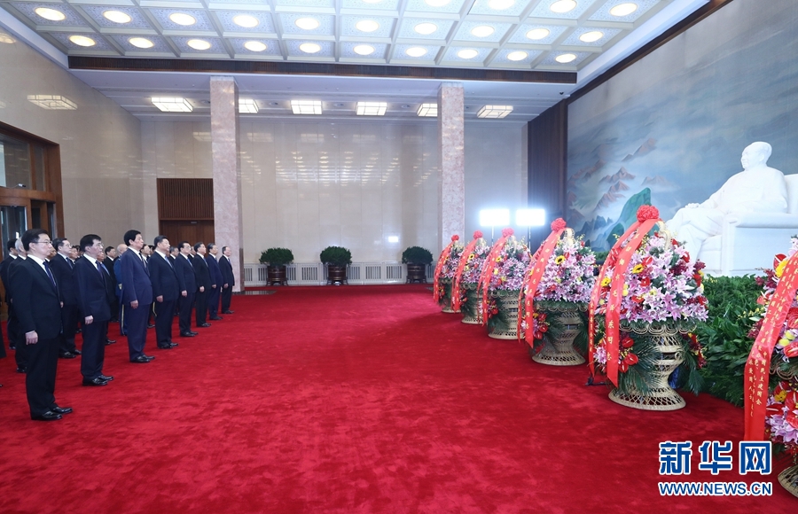 敬獻花籃儀式前,習近平、李克強、栗戰(zhàn)書、汪洋、王滬寧、趙樂際、韓正、王岐山等領(lǐng)導同志來到毛主席紀念堂。北大廳內(nèi),中共中央,全國人大常委會,國務(wù)院,全國政協(xié),中央軍委,各民主黨派、全國工商聯(lián)和無黨派愛國人士敬獻的花籃擺放在毛澤東同志坐像正前方。習近平等向毛澤東同志坐像三鞠躬,隨后來到瞻仰廳,瞻仰毛澤東同志遺容,表達對毛澤東同志等老一輩革命家的深切緬懷。