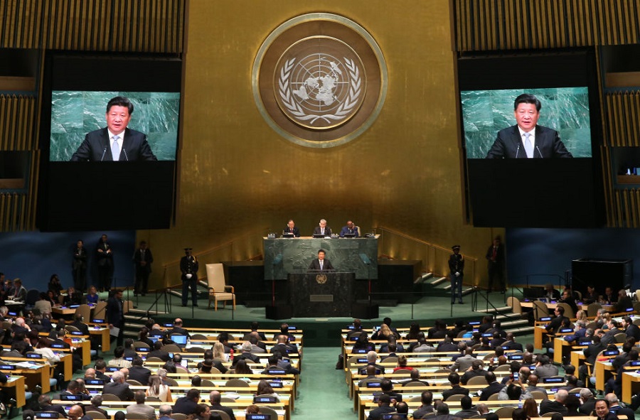 2015年9月28日,國家主席習近平在紐約聯合國總部出席第70屆聯合國大會一般性辯論并發表題為《攜手構建合作共贏新伙伴 同心打造人類命運共同體》的重要講話。新華社記者龐興雷攝