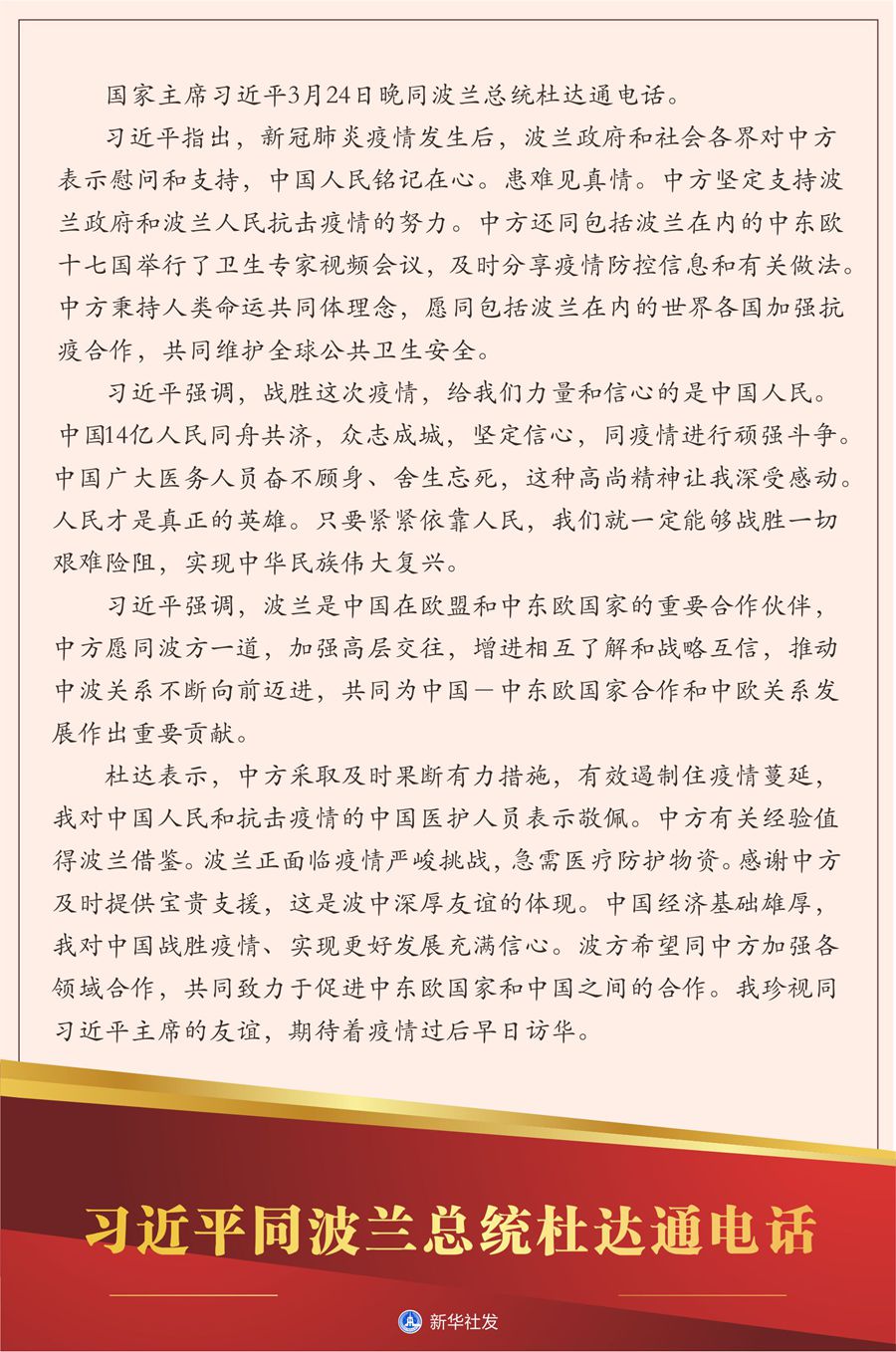 新華社北京3月24日電? 國家主席習近平24日晚同波蘭總統杜達通電話。