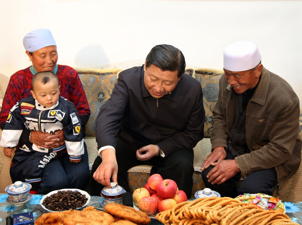 (2008年4月8日,習(xí)近平在固原市原州區(qū)開城鎮(zhèn)深溝村考察新農(nóng)村建設(shè)情況時看望回族農(nóng)民金學(xué)文一家,并在農(nóng)民家品嘗當(dāng)?shù)氐纳w碗茶。新華社記者蘭紅光攝)