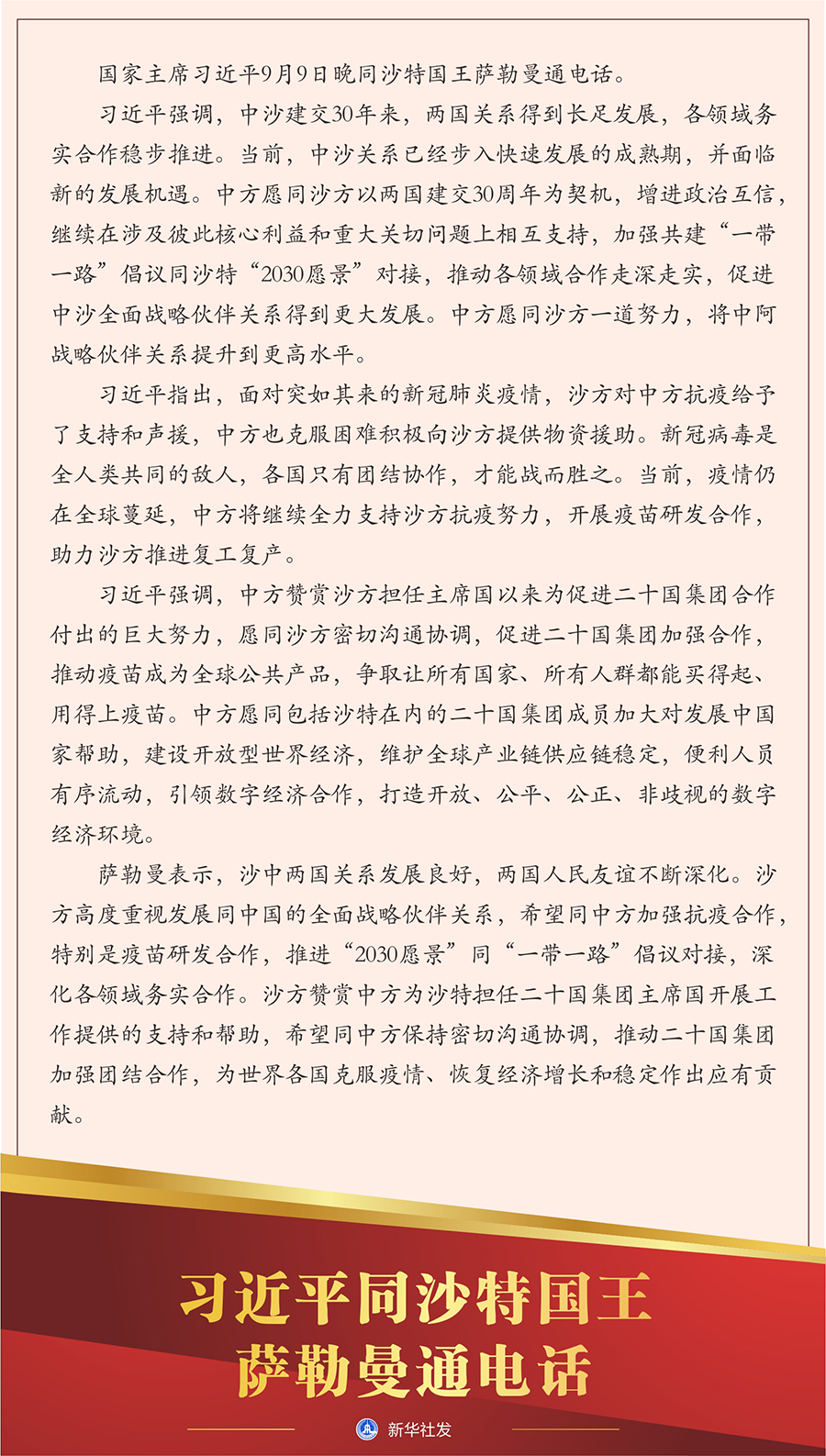 新華社北京9月9日電? 國家主席習近平9月9日晚同沙特國王薩勒曼通電話。