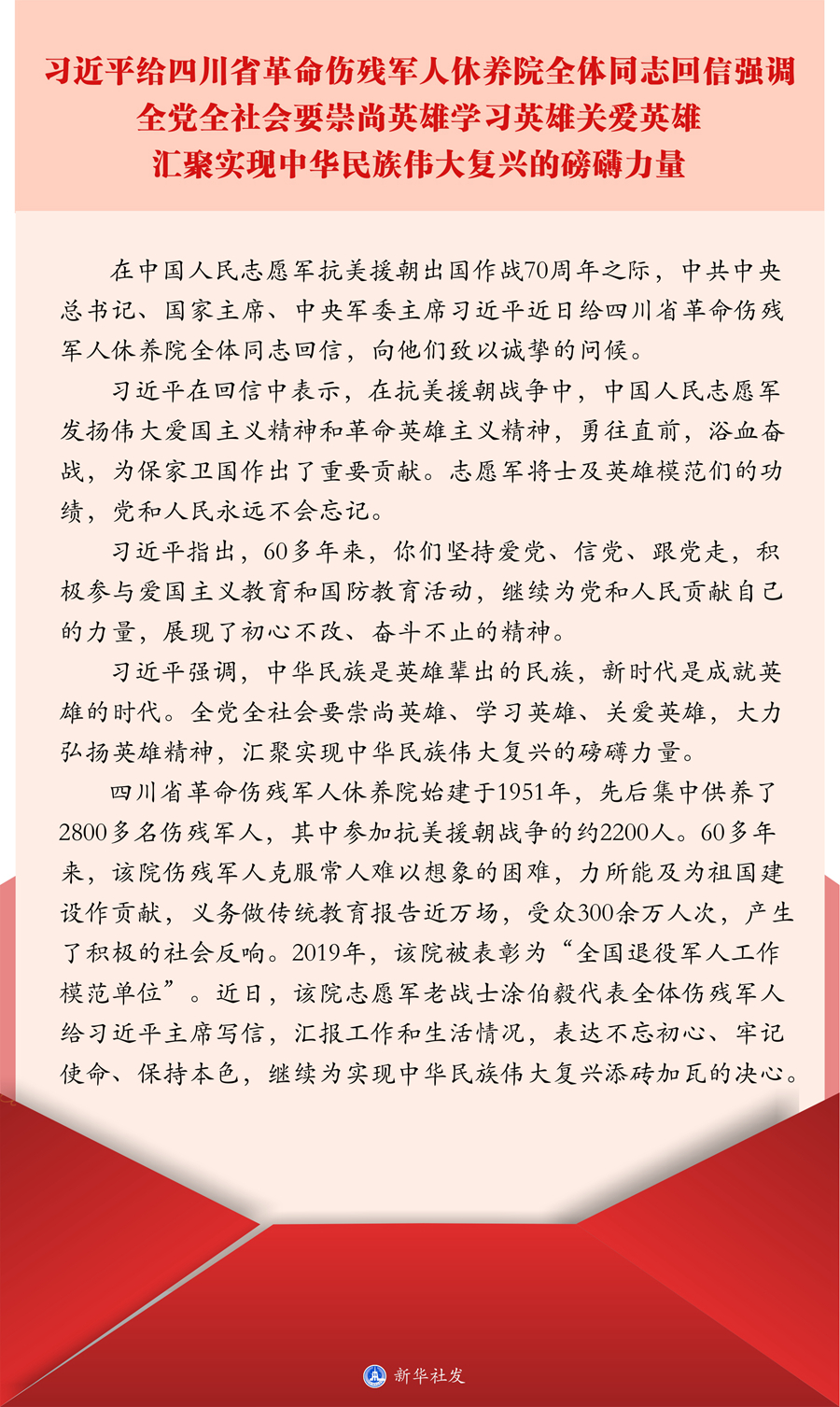 習近平給四川省革命傷殘軍人休養院全體同志回信強調 全黨全社會要崇尚英雄學習英雄關愛英雄 匯聚實現中華民族偉大復興的磅礴力量