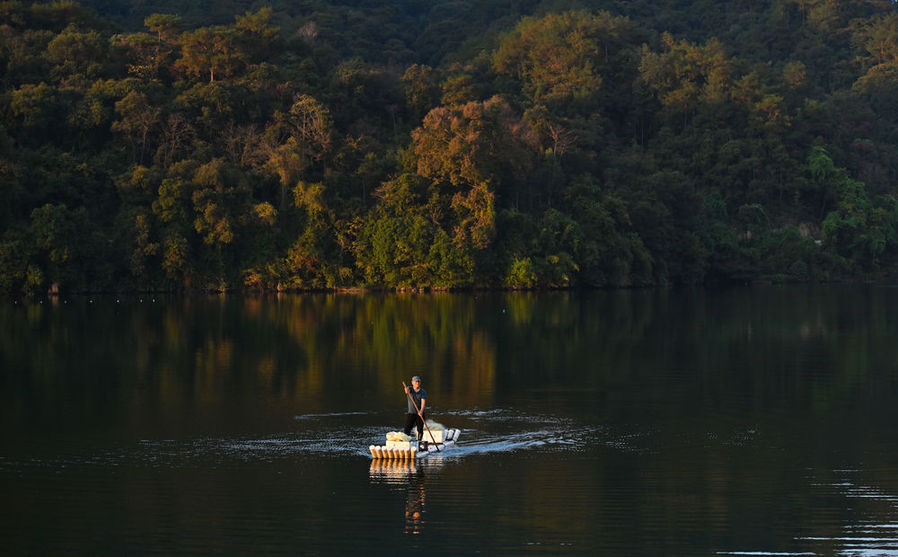 11月20日,常口村村民在村旁的金溪上劃船。?新華社記者 宋為偉 攝