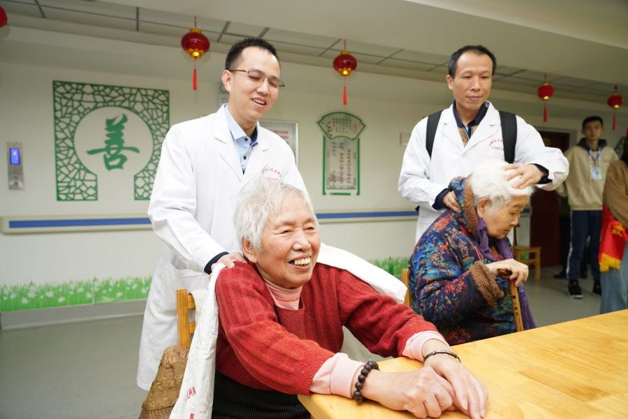 三明市盲協主席江華帶領盲人志愿團隊為社區老人按摩推拿。周志鴻 攝