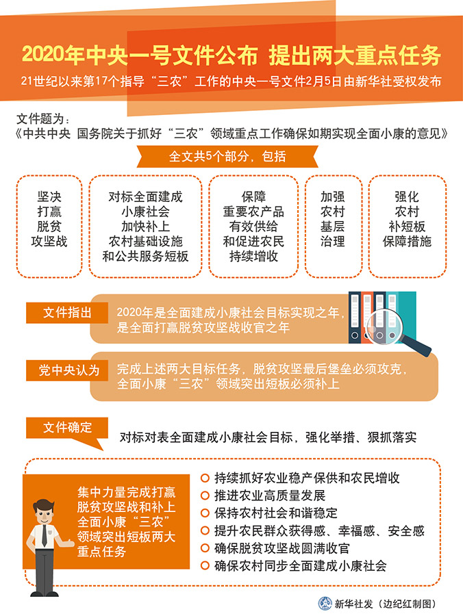 這份文件題為《中共中央 國務(wù)院關(guān)于抓好“三農(nóng)”領(lǐng)域重點工作確保如期實現(xiàn)全面小康的意見》,全文共5個部分,包括:堅決打贏脫貧攻堅戰(zhàn);對標(biāo)全面建成小康社會加快補上農(nóng)村基礎(chǔ)設(shè)施和公共服務(wù)短板;保障重要農(nóng)產(chǎn)品有效供給和促進農(nóng)民持續(xù)增收;加強農(nóng)村基層治理;強化農(nóng)村補短板保障措施。