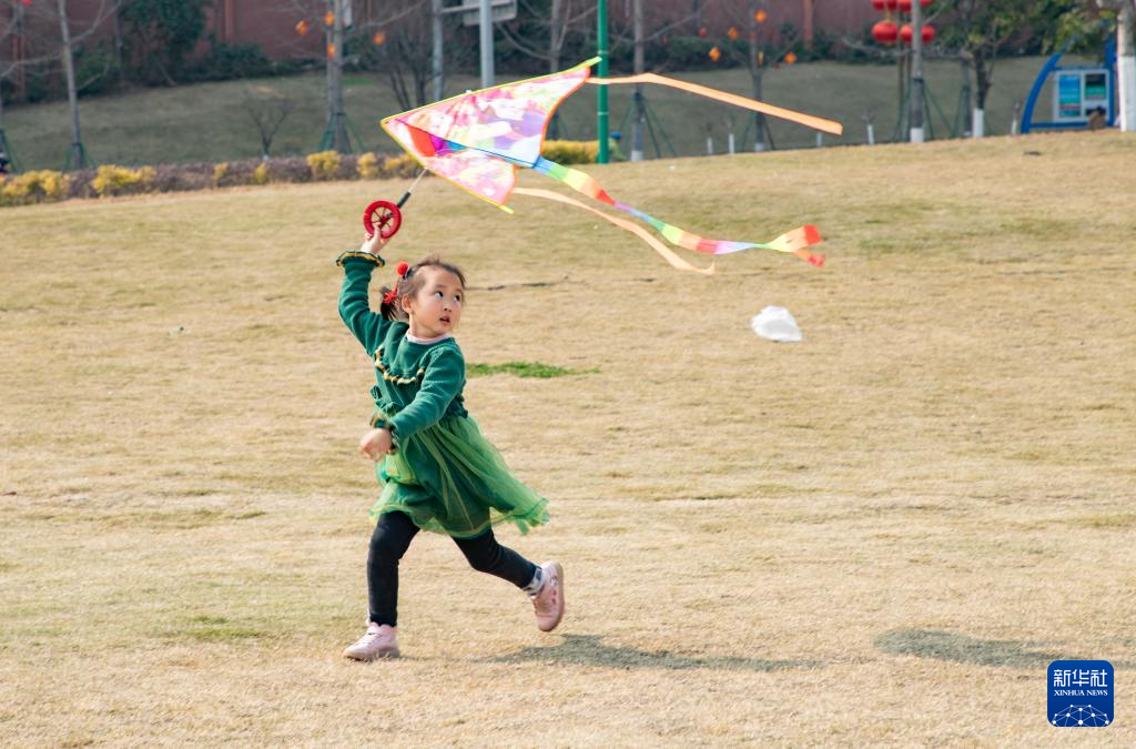 2月26日,小朋友在湖北省宜昌市秭归县茅坪镇望江公园放风筝。