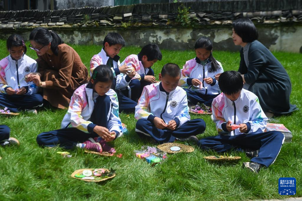 4月12日,诸暨市东白湖镇斯民小学的学生在“寻找春天的色彩课程”中制作花草画。