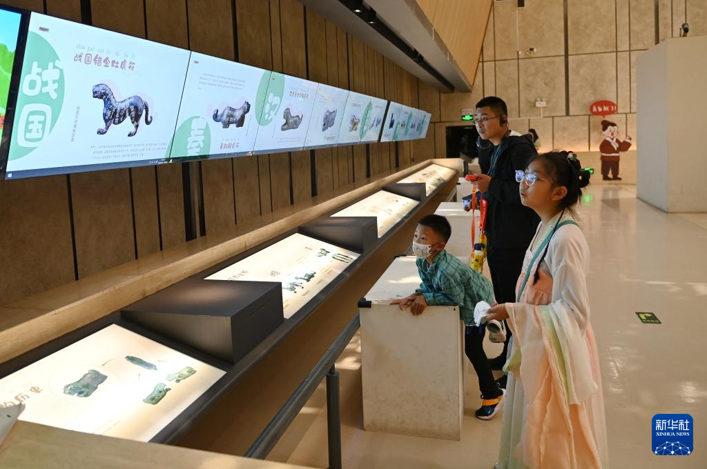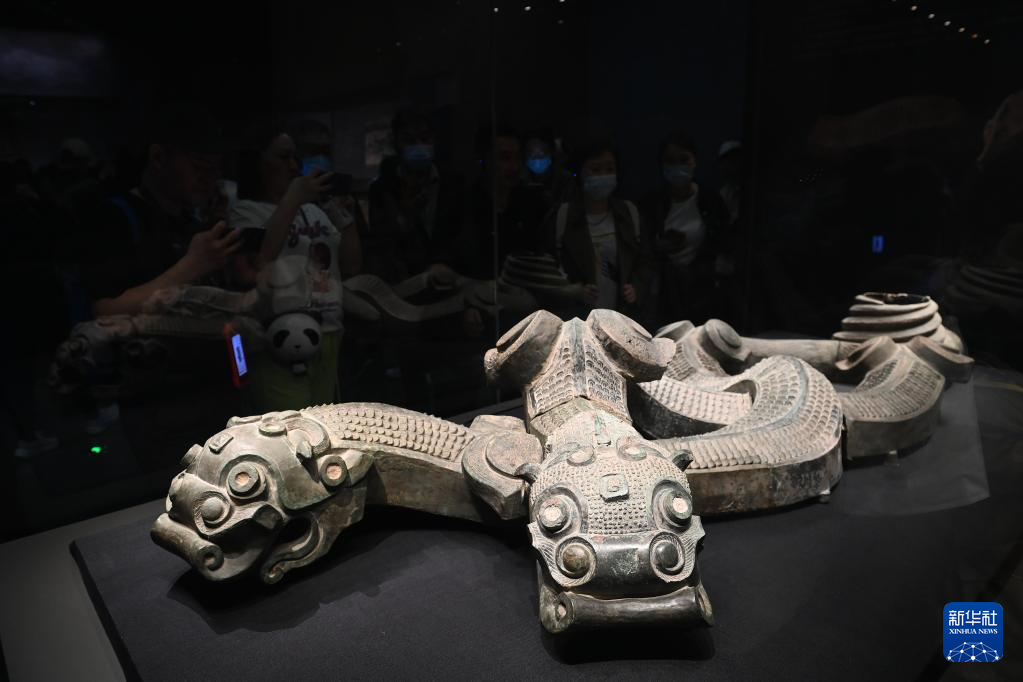 5月11日,游客在陕西历史博物馆参观馆藏战国文物青铜龙。