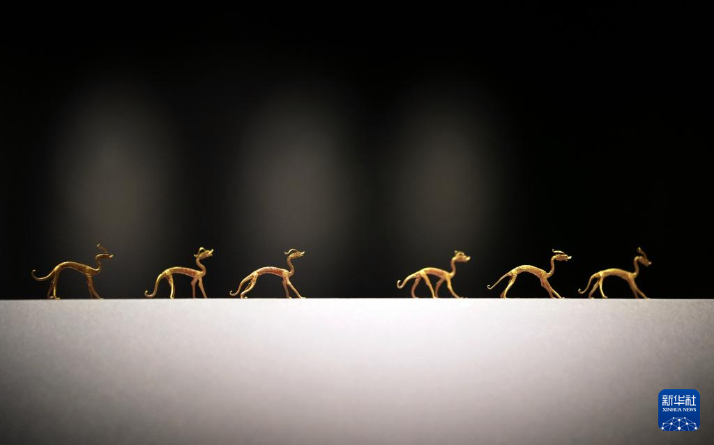 这是在陕西历史博物馆“大唐遗宝——何家村窖藏出土文物展”上拍摄的赤金走龙(2022年5月18日摄)。