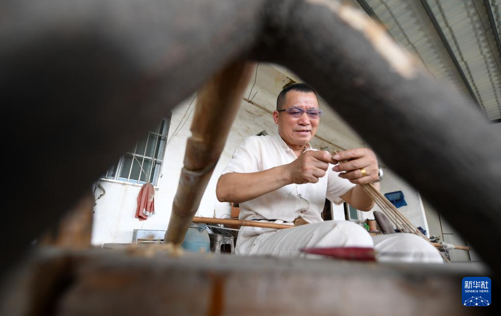 6月1日,在广西宾阳县宾州镇陆村,陆云岗在制作油纸伞。