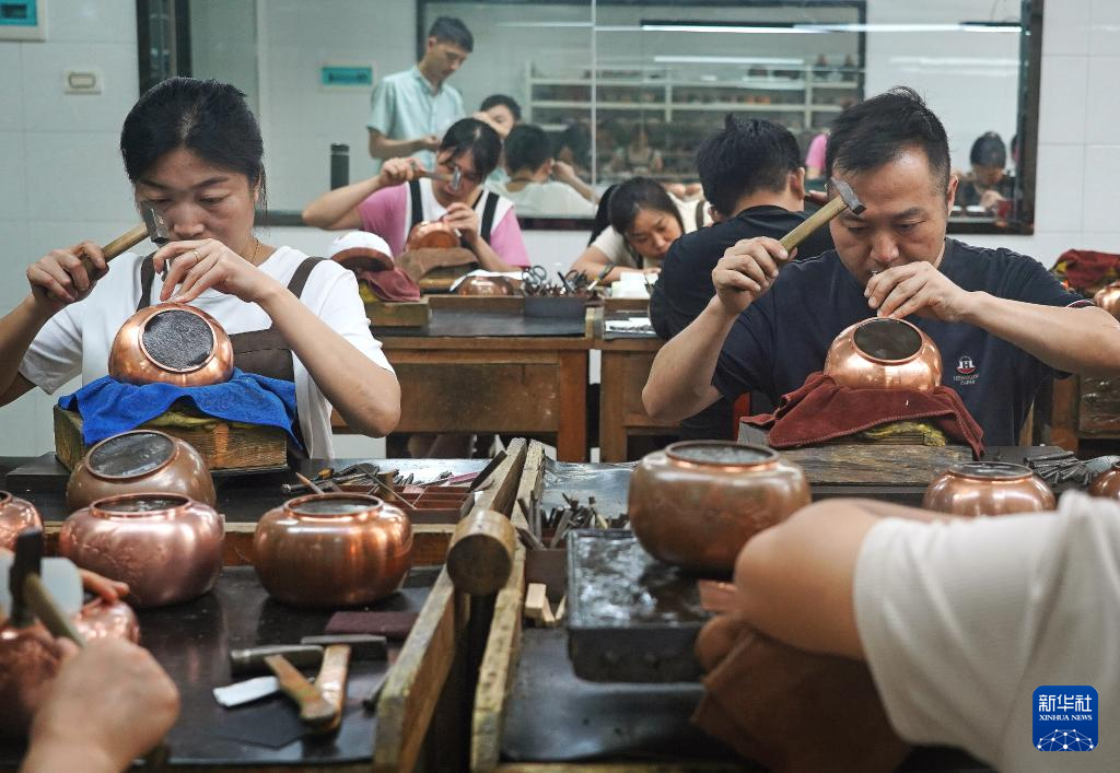 在位于江西省贵溪市的江西中鼎金属工艺有限公司的车间里,匠人们在雕刻铜壶(7月13日摄)。