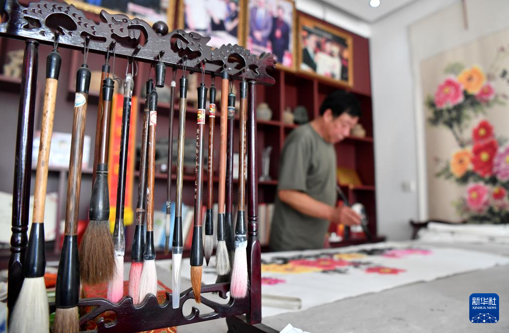 7月26日,平乐牡丹画产业带头人之一的画师郭泰森在自己的工作室绘制牡丹画。